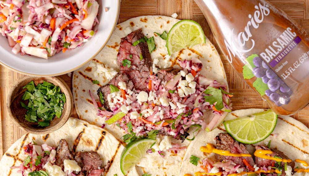 These vibrant tacos bring together tender grilled skirt steak, crisp cabbage and apple slaw, and the rich tang of Marie’s® Balsamic Vinaigrette.