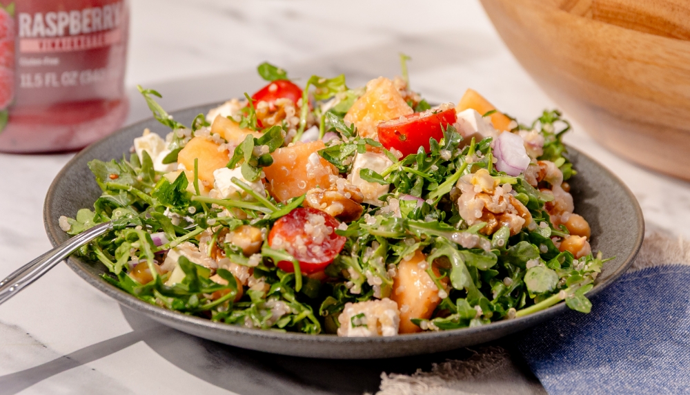 Add parmesan, croutons, Marie’s Caesar Dressing, and grilled chicken to a couple layers of iceberg leaves.